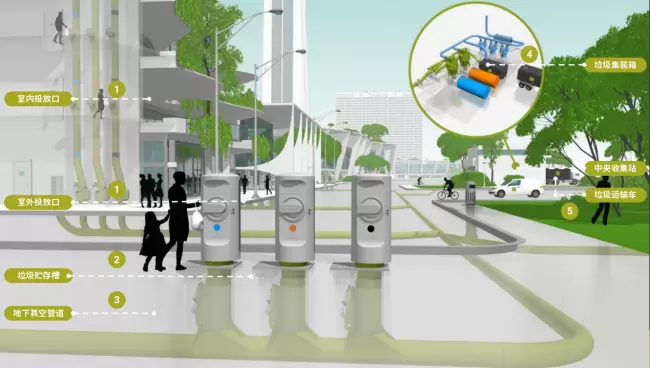 针对城市社区、公共区域等场景,系统通过投放口、真空传输管道与收集中心的高效协同实现垃圾收运。投放口支持刷卡、人脸识别等无接触操作满足分类需求。传输管道利用真空负压技术,以70-80公里/小时的速度输送垃圾,最大覆盖半径达2公里;收集中心通过压缩、存储等工序集中处理垃圾,最终由专用设备密闭运输。