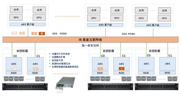 InfiniBand提供400Gbps基础传输速度,配合Multi-Rail负载均衡,实现大规模并行访问无拥塞。