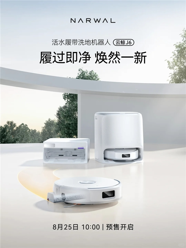 8月21日消息,今天云鲸智能官方在社交平台宣布将于8月25日发布J系列扫拖机器人新品J6,并于当天上午10:00开启全网预售。从官方预热海报来看,云鲸J6定位“活水履带洗地机器人”,或将首次配备高端旗舰逍遥002同款活水履带清洁技术,科学解决传统拖布形态弊端,为用户带来更极致的清洁方案。