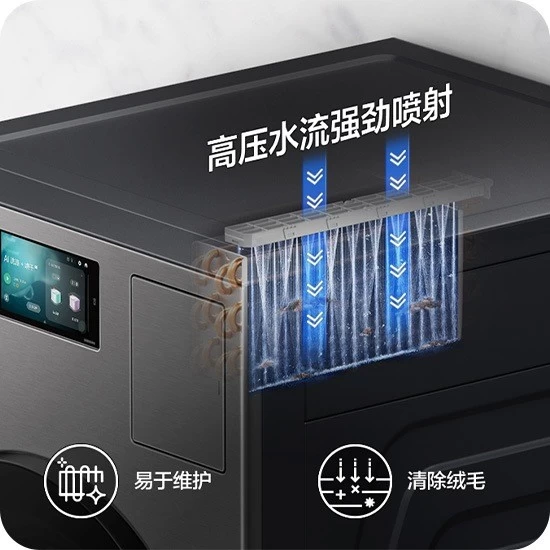 而烘干过程中积聚在机器内部的绒毛和灰尘,是滋生细菌、影响烘干效率及空气质量的隐患。三星AI神 黑钻热泵洗烘旗舰的冷凝器自清洁系统,能通过强力喷头在运行中自动冲刷热交换器,有效清除污垢与绒毛。这不仅保障了烘干性能持久高效,更从机器内部切断污染源,确保每一次烘干都是洁净干爽的热风。