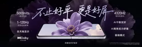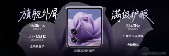 荣耀 Magic V Flip2 采用“4.0 英寸外屏 + 6.82 英寸内屏”的组合,超美小直屏搭配轻薄竖折机身,既兼顾了日常携带的便携性,又不失时尚格调。屏幕规格上,荣耀 Magic V Flip2 采用了 LTPO UTG OLED 内屏,2868*1232p,峰值亮度达到 5000nits,120Hz 刷新率,支持 4320Hz PWM;LTPO OLED 外屏尺寸分辨率达到了 1200*1092p,支持 120Hz、3600nits 峰值亮度、3840Hz PWM。此外,护眼方面,内外屏均搭载荣耀绿洲护眼屏,支持 AI 干眼友好、AI 离焦视力舒缓、类自然光护眼、AI 助眠显示等护眼功能。