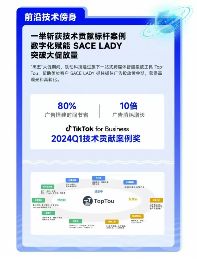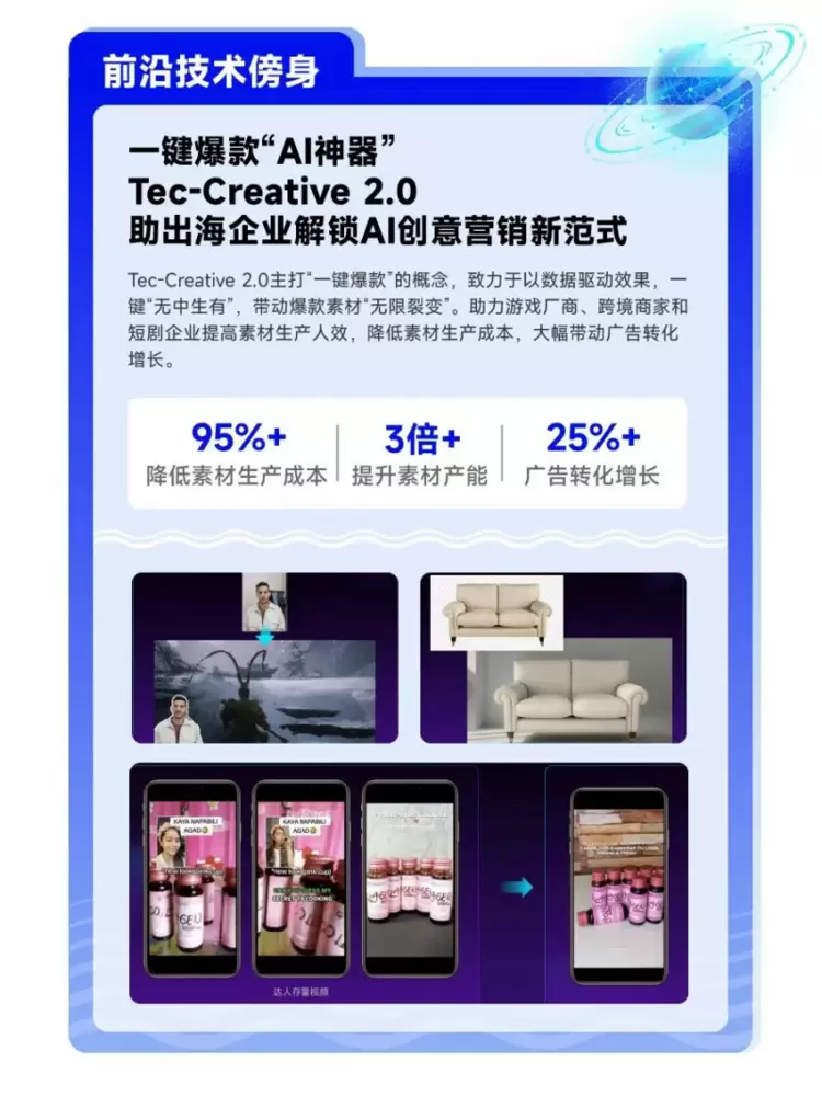 创新技术始终是钛动科技的根基。钛动科技在行业内首创聚合全球媒体的SaaS平台——Tec-Ad,通过UniAgency和TopTou等工具帮助出海企业一站式完成多媒体开户充值、管理预算、市场洞察、创意生成与创意资产管理、全媒体投放,并实时进行效果分析,覆盖出海营销全链路各环节。在数字化技术加持下,出海企业得以突破大促放量上限,实现消耗成倍增长,大幅加快出海步伐。钛动科技旗下的企业智能营销AI创意工具——Tec-Creative 2.0,则致力于打造一站式AIGC解决方案与创意工具平台,让“一键爆款”变得触手可及。