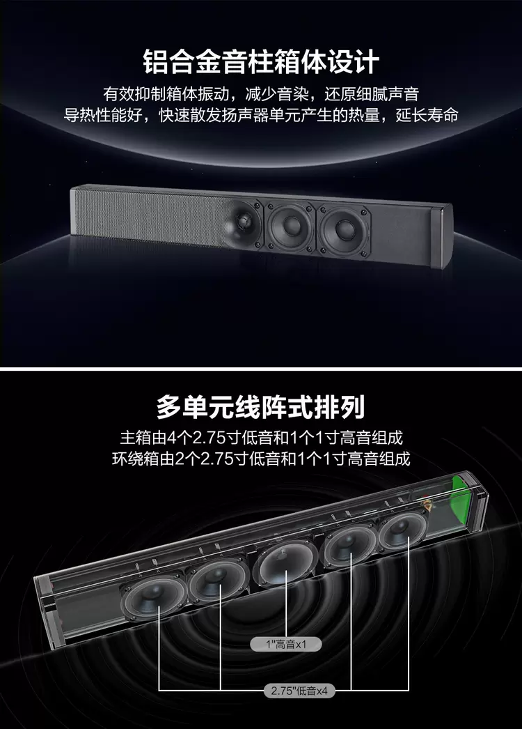 环绕声场优化技术:独特的箱体结构与声学设计,有效拓宽声场,增强声音的包围感与定位感,即使未配置多声道系统,也能营造出极具沉浸感的观影氛围。