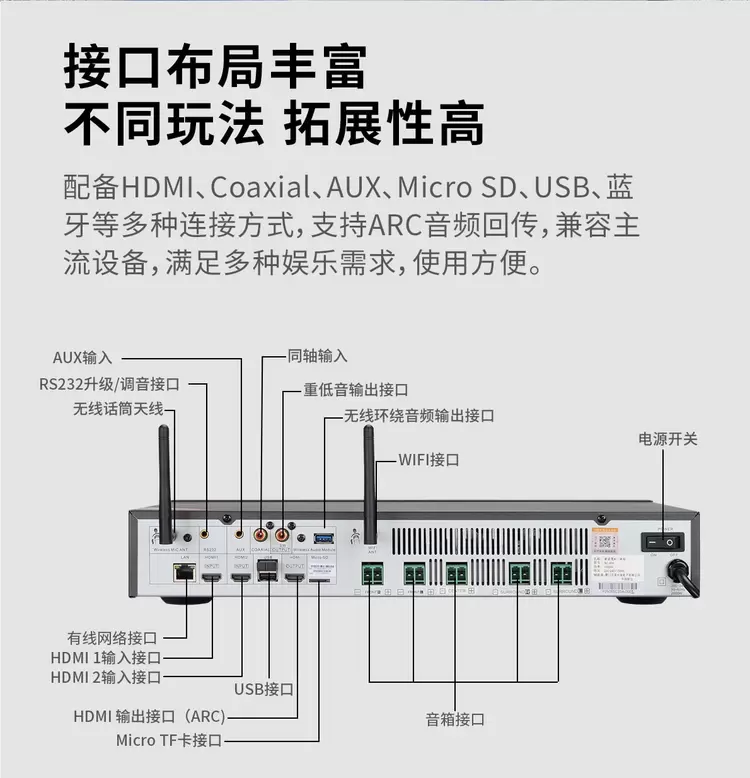智能连接中枢:丰富接口,轻松连接电视、游戏主机、手机、平板等各类设备。蓝牙连接稳定快速,延迟低,满足无线影音需求。