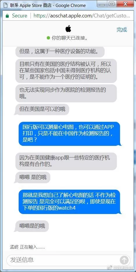 在咨询后得知,国行版Apple Watch Series 4也是支持心电图功能的,还可以通过iPhone的健康App来同步心电图进行打印,只是在中国不能作为检测报告,原因是在中国尚未获得医疗机构的认证(详情可参考该网友与客服的对话)。