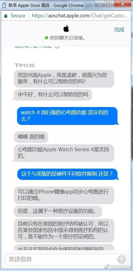 心电图功能可以监测心率过低、以及心房纤颤的心律不齐,它能够把心电图生成 PDF 报告发送给医生。Apple Watch Series 4还获得了美国食品和药物管理局的认证,这也是新的Apple Watch的主要亮点之一。不过苹果此前宣布该功能暂时仅限美国用户使用,国行版本今天也已经正式发售了,那么它是否支持这一新特性呢?为此,有网友咨询了苹果官方客服。