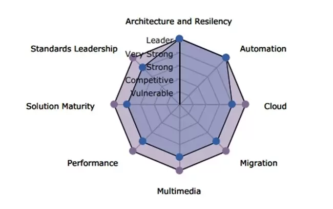 《5G移动核心网竞争力评估报告》从架构、云化、性能、多媒体、自智网络、演进、方案成熟度、标准领导力八大维度对全球供应商5G移动核心网方案进行了全面评估,华为再次在所有维度均获得了领导者评价,彰显了华为在核心网领域的长期投入、产品竞争力和产业贡献。