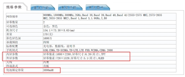 该机最大的亮点是采用了双屏设计,其主屏尺寸为6.26英寸,分辨率为2280×1080,屏幕纵横比为19:9,副屏尺寸为5.1英寸,分辨率为1520×720,屏幕纵横比同样为19:9,材质为OLED。