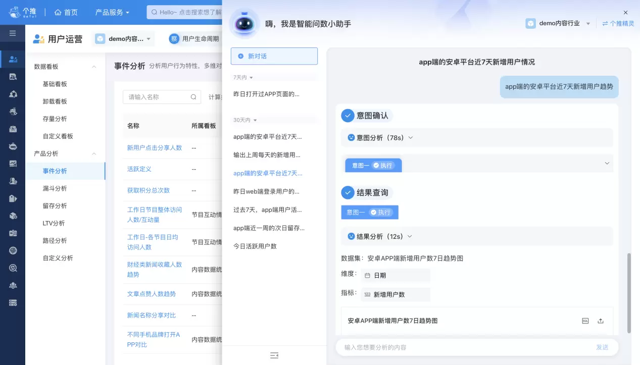 AI应用时代为APP带来了新机遇,同时也对运营增长提出了新的要求,这也使得高效、智能的数据分析成为刚需。每日互动(个推)依托深厚的数据智能积累,将大数据与AI大模型深度融合,对个推用户运营平台进行智能化升级,正式推出智能问数助手。该功能作为一款企业级对话式Data Agent,内嵌于个推一站式用户洞察和数据分析平台中,帮助运营开发、管理和数据团队通过自然语言对话,快速完成APP运营与用户数据的统计分析这一核心任务,高效推进APP用户与业务增长。