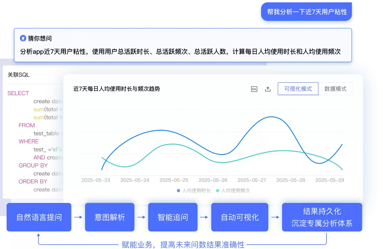 基于以自然语言提问的交互方式与两种数据分析语言的回答形式,智能问数助手可以充分适配不同角色使用习惯。例如企业管理者可实时获取重点指标数据与关键指标解读等等,提升决策效率;运营人员能自主完成多维度下钻、对比归因等深度分析,快速定位增长瓶颈;数据团队则从日常提数、查数、做报表中解放,更专注于高价值数据模型构建与标签体系优化,全面提升APP用户运营与数据分析的流程效率,并驱动着APP运营向人与AI协同的智能运营模式演进。
