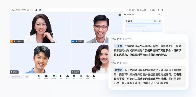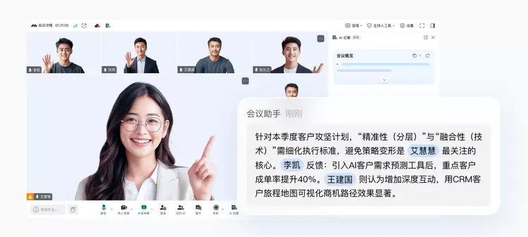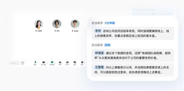 在会议过程中,“AI纪要”每2分钟自动刷新内容,其中包含近2分钟的实时讨论要点,以及从会议开始到当前的完整概要。无论是管理者实时把控会议进度,还是参会者快速同步信息,均能实现信息不滞后、决策更迅速。