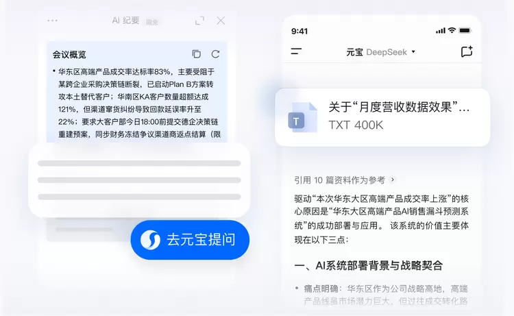 值得一提的是,腾讯会议还进一步打通腾讯元宝。会议结束后,用户不用手动复制会议内容,可直接跳转至元宝平台,针对该场会议的任何内容进行提问,并支持混元、DeepSeek双模型切换,让信息检索更高效、问答更全面。