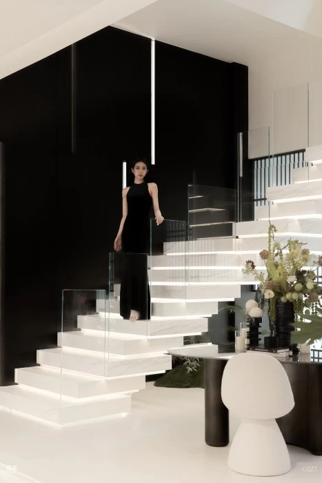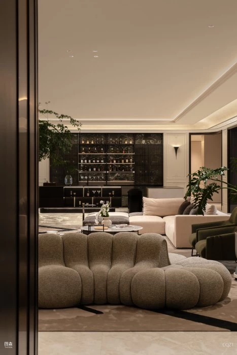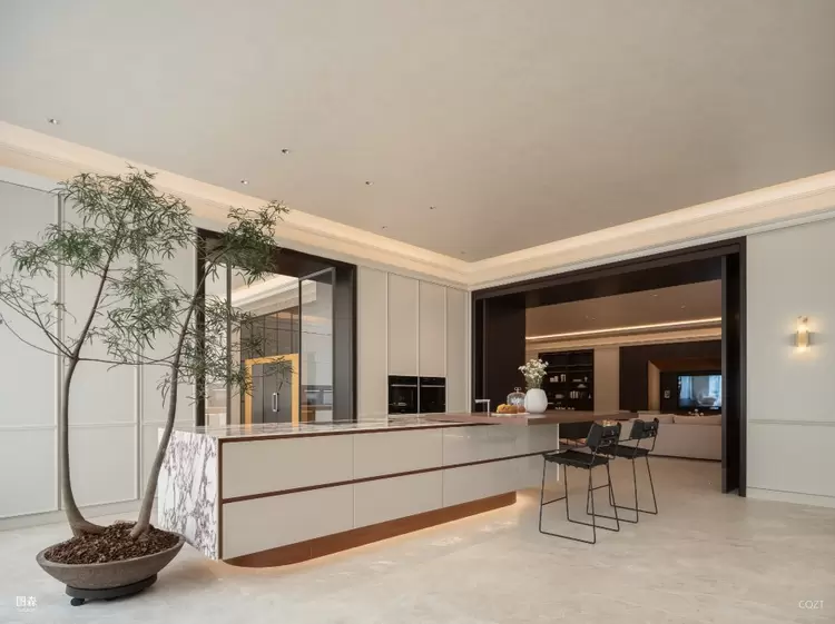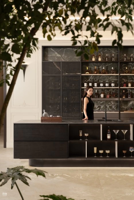 当转轴门轻启,浅色基调中舒展的客厅,明暗转换如梦境照进现实。木饰面的线性肌理勾勒空间骨架,深色序厅的铺垫让浅色区域更具水墨留白般的空灵张力。家具搭配赋予温度,多元场景与细节设计诠释当代会客之道,邀人落座感受艺术气息。这里不仅是产品陈列空间,更是一处诠释优雅松弛社交、传递未来美学的艺术会客厅。水吧区岛台成为视觉焦点,木质台面衔接多元材质模块,纤薄造型融合功能与艺术气质,既可独处亦宜社交。移动台面与绿植点缀平衡理性与温情。这里以细腻的光影设计和场景营造,让艺术与生活于此悄然交融。