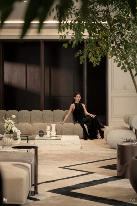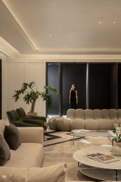 “‘艺术是什么’是个永恒问题,如果找到了答案,艺术可能就停滞不前了。”图森对现代生活方式的艺术化诠释,并非刻意追随艺术的脚步,而是为了令艺术融进生活日常。2000平方米的空间于秩序中蕴含自由的镜头语言徐徐展开。入户序厅采用深色图森PUCCINI系列木饰面铺陈,一对奔腾骏马雕塑打破沉稳基调,在矛盾中达成先锋与经典的平衡。