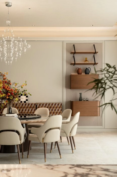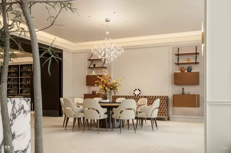 中西餐相结合的餐厅组合,以文化融合与生活仪式感为内核,展开一场传统与当代的对话。中餐厅空间,整体采用图森PUCCINI系列木饰面和图森·C经典系列产品,色调趋于淡雅中性。温润木质悬挂架兼具收藏展示功能,繁星灯具洒落暖光,围合出家人好友共聚的温馨场景。西餐区则强调收纳美学与社交互动,柜门可开启155度,嵌入式电器与柜体保持在一个平面上,保持视觉平整,岛台抽屉有序收纳厨具,方便取用。可参与美食制作的开放布局,配以红酒与话题,诠释现代餐饮的精致体验。现代感与传统韵味形成巧妙呼应,这种并置不仅展现了餐饮文化的变迁,更激发着使用者对生活美学的思考。在这里,每一次用餐都是一次艺术感触的唤醒。在熟悉的东方烟火气中,发现被重新诠释的生活仪式感。