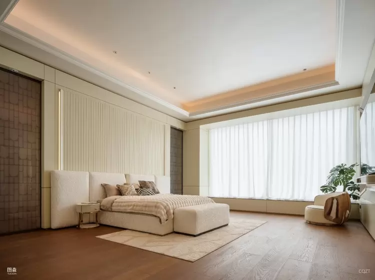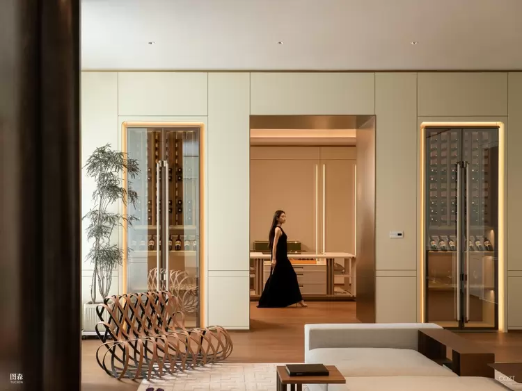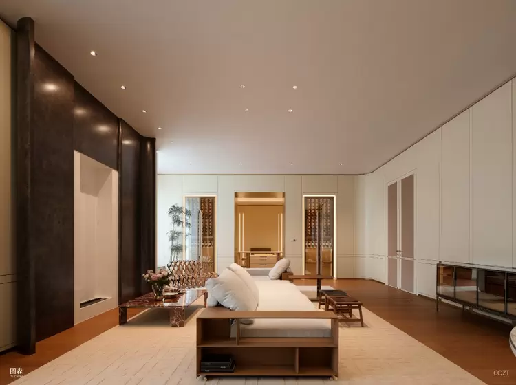 图森PANAREA轻奢系列空间,以“诗意栖居”为内核,构建出一处兼具理性功能与感性美学的精神领地。卧室空间以精确比例划分墙面,弧线金属包边电视背景墙与智能光影系统交织,适配睡眠、阅读、观影等多重场景,在严谨线条中透出浪漫气息。灯光与木饰面、金属、皮革等多重材质的互动,空间散发着优雅的光晕。衣帽间以“量身定制”为核心,将功能性与艺术美学完美融合,打造出兼具实用与奢华的私人空间。淡雅基调中,玻璃柜体与皮革岛台虚实交错,玫瑰金铜镶边勾勒出精致轮廓,爱马仕橙的跃然点缀,更添活力。从晨光漫入时酒红色木饰面的丝绸光泽,到夜晚酒柜中取酿品酌的深邃时光,空间始终以弧形转角、藤编躺椅与模块化沙发等细节设计,回应着居者从容舒展的生活节奏。这里不仅是收纳与休憩的场所,更是一场视觉、触觉与光影共同谱写的日常仪式,让每一次晨昏流转皆成为可感知的优雅诗意。