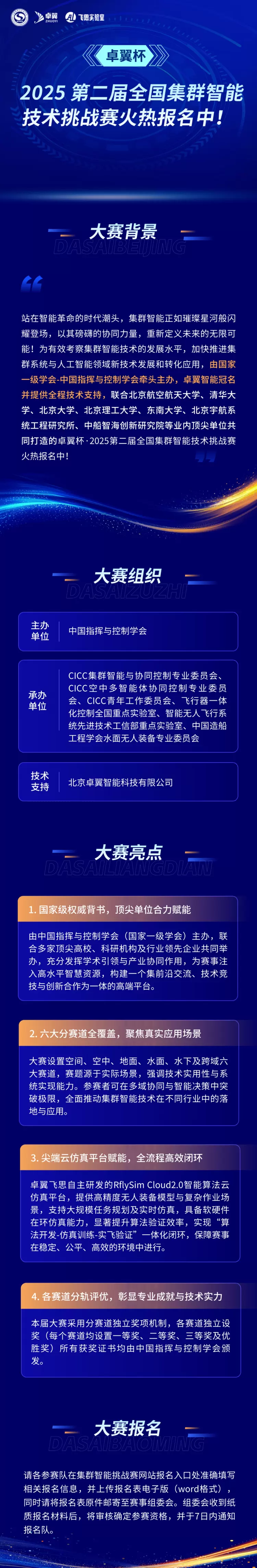 为深入贯彻国家创新驱动发展战略,有效考察集群智能技术的发展水平,加快推进集群系统与人工智能领域新技术发展和转化应用,不断探索未来无人集群系统智能协同作业的应用样式,中国指挥与控制学会联合多家顶尖高校、科研机构及行业领军企业,共同举办“卓翼杯·2025第二届全国集群智能技术挑战赛”。大赛旨在打造集群智能领域高水平的交流与竞技平台,充分发挥竞赛的引领作用和试金石功能,推动该领域的学术进步与产业协作。“高校-科研院所-领军企业”深度融合的支撑体系,为赛事的技术深度、专业广度及成果转化能力提供了坚实保障。