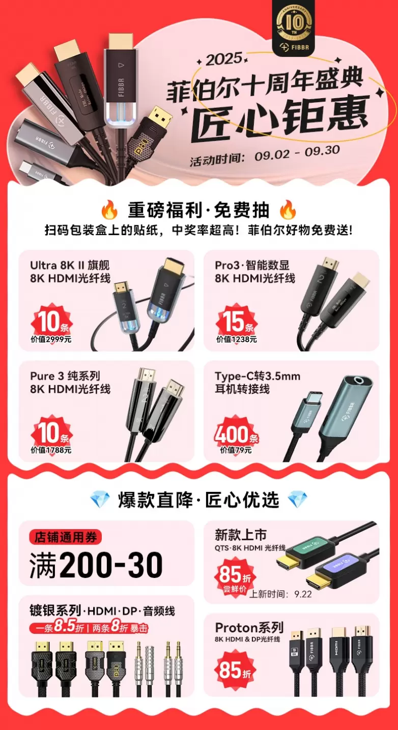2025年9月2日,国内知名高端影音配件品牌菲伯尔(FIBBR)将正式启动十周年庆典活动。本次以"十年匠心,连接视界"为主题的庆典,将带来长达一个月的超值优惠和精彩互动,回馈十年来支持品牌发展的广大消费者。