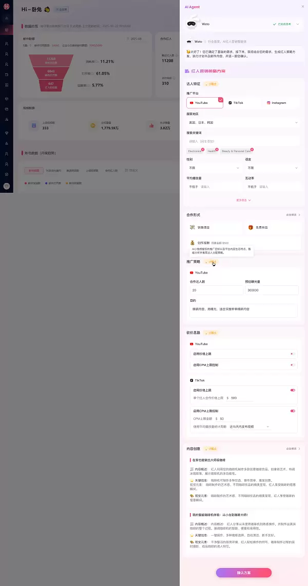 不仅能快速生成红人营销方案,更能输出结构清晰、策略完整、可直接推进的深度策划,涵盖从达人筛选到内容创意的全部关键环节: