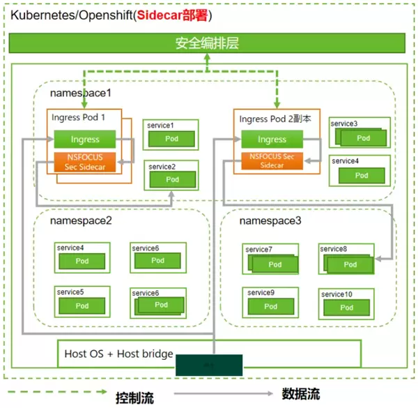 创新方案支持两种场景部署,一种是适配于Ingress南北向流量防护场景,通过在Ingress Pod旁挂安全容器实现对恶意流量的劫持和处理。