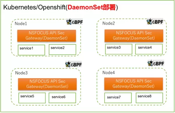另一种适配于全向API流量防护场景,通过在每个Kubernetes节点部署Daemonset安全容器实现恶意流量的劫持和处理。