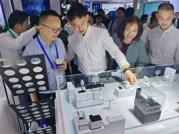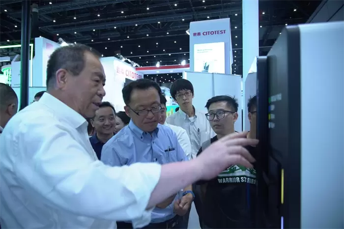 江丰生物董事长兼总经理刘炳宪先生(左一)介绍KF-PRX高通量扫描仪