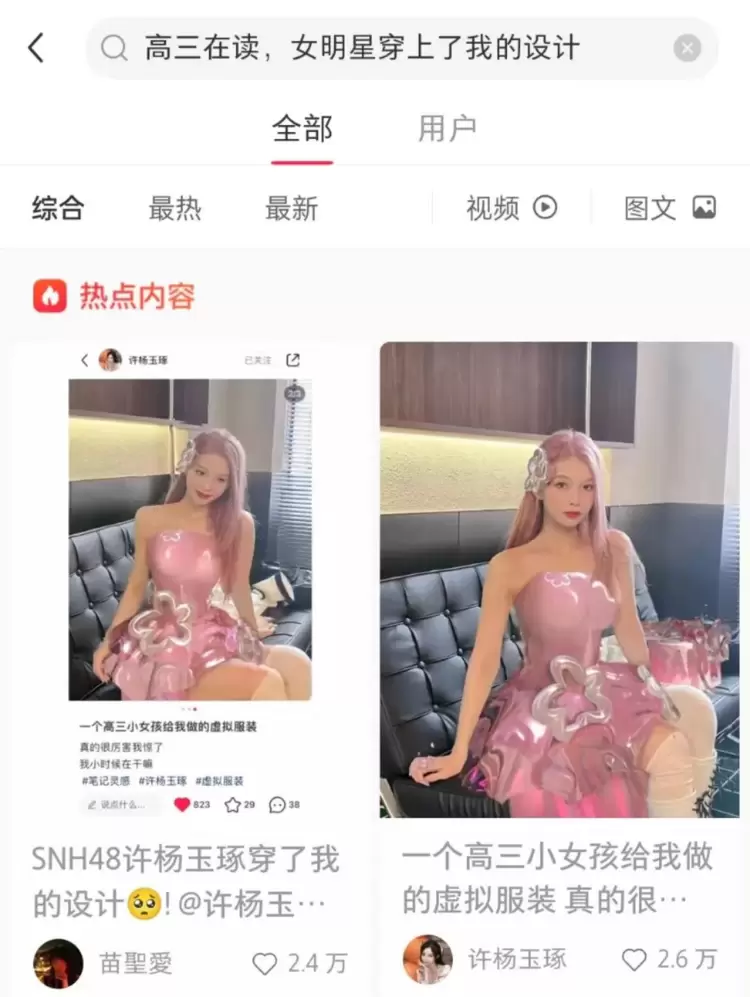 很快,她迎来为艺人许杨玉琢设计虚拟服装的机会。相关小红书笔记意外爆火,数百万浏览量像聚光灯般打在她身上,让这个 2004 年出生的创作者首次进入主流视野。