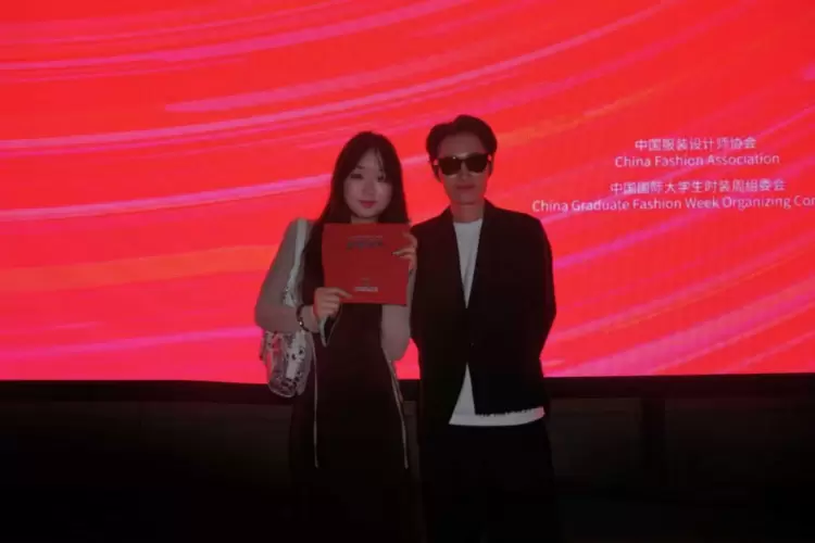 *苗聖愛在第一届“Style3D数智未来”设计大赛现场与其指导老师陈鹏
