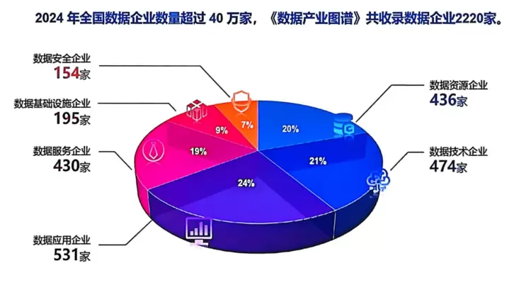图谱数据显示,截至2024年,全国数据相关企业总量已突破40万家。通过对海量企业的筛选与评估,图谱最终收录了2220家代表性企业,系统构建了涵盖数据基础设施、数据安全、数据资源、数据服务、数据技术、数据应用六大领域的数据产业全景视图。