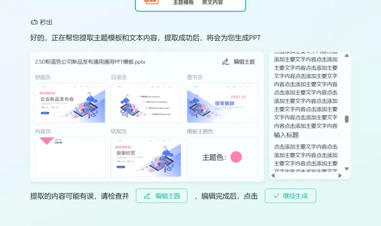 如果你要使用本地模板,可以在上传PPT之后再输入要做的PPT主题,这时候AI就会自动提取你上传的PPT版式然后根据你的主题生成PPT。