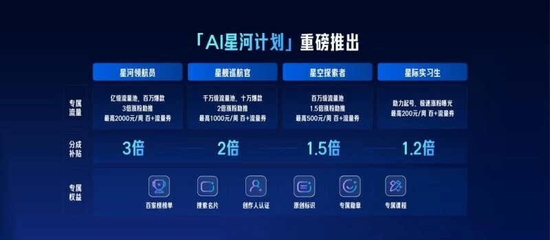 此项计划依据作者的AI技术能力与内容创作能力,区分了4档AI创作者,分别为星河领航员,星舰巡航官,星空探索者和星际实习生。通过分级定制化提供相应的扶持套餐,最高可享受亿级流量池和3倍分成补贴。开放更多AIGC专属权益,比如百家榜榜单、搜索名片大卡,AI创作者勋章等,同时将推出系列课程辅导,帮助创作者快速在百家号完成AI起步和创作探索。