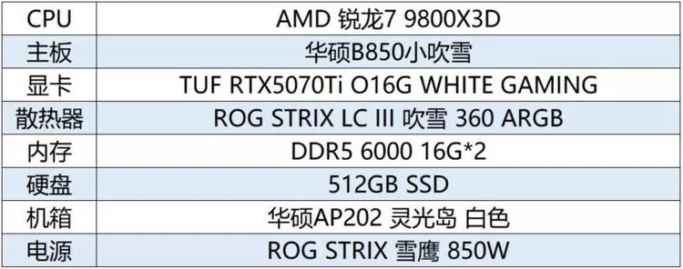 首先为大家推荐一套颜值与性能并存的白色主机,以华硕B850小吹雪主板为核心,搭配AMD锐龙7 9800X3D处理器、华硕TUF RTX5070Ti O16G WHITE GAMING显卡等令人心动的电竞装备,可高画质流畅运行各类大作,整机灯效也能带给用户无与伦比的沉浸式游戏体验!