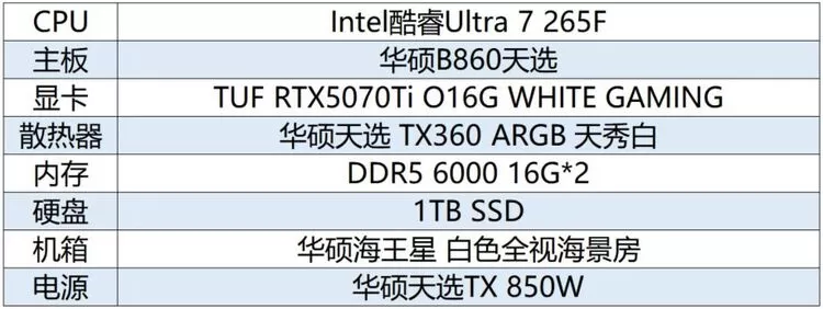 接下来推荐的这套是玩家心中的“白月光”。以华硕B860天选主板为核心,搭配Intel酷睿Ultra 7 265F处理器、华硕TUF RTX5070Ti O16G WHITE GAMING显卡等高性能硬件,不仅带来冰川秘境般的视觉享受,更有巅峰战力,高帧畅玩无压力!