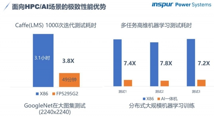 「针对目前业内出现的一机 8 GPU 的 x86 服务器,我们也进行了性能对比,发现 4GPU 的 Power 服务器比 8GPU 的 x86 服务器还要快。这体现了 Power 架构在并行化方面的巨大优势。」浪潮商用机器技术工程师孙建介绍道。