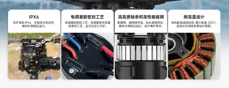 - 植保无人机应用:如浇水施肥、农药喷洒、多光谱病虫害监测等,为植保领域无人机提供更稳定的力效和更强的单次负载能力,减少飞行作业时间。IPX6防护等级,无惧雨水和农药,悬停作业,安全性、稳定性更强。