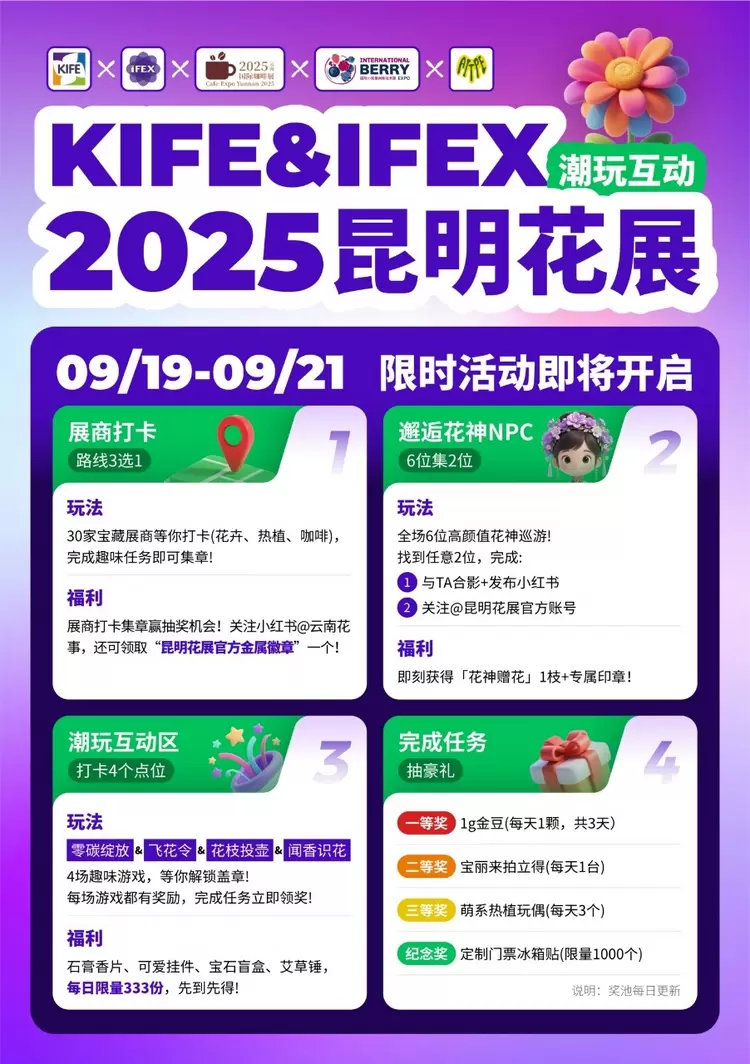 ·花神NPC互动:关注小红书@IFEX国际花卉园艺展,寻找现场6位花神NPC与任意2位合影,带话题#昆明花展#亚洲国际热植展#云天化免费送9K朵鲜花,发布30字笔记,即可领取花神专属印章及免费鲜花!