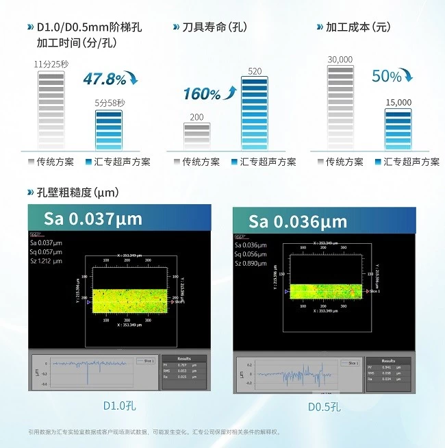 对此,汇专凭借在高端超声绿色数控机床及关键部件的研制经验,推出了针对性的半导体行业超声高效加工解决方案。采用汇专超声绿色雕铣加工中心UEM-600 PLUS,搭配自主研发的超声振幅测量仪、超声冷压刀柄及高效飞速PCD钻头进行加工,单孔加工时间从11分25秒缩短至5分58秒,加工效率提升47.8%,刀具寿命提升160%,加工成本降低50%,显微镜放大至50倍检测,孔口崩边量≤0.02mm。