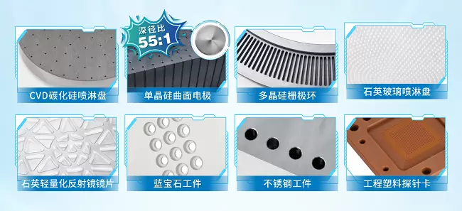 除了在CVD碳化硅喷淋盘加工上实现创新突破,该系列加工中心搭配汇专超声加工技术和整体PCD刀具的解决方案,在硬脆材料、金属材料、工程塑料等超深微孔及高精度质量加工中具有明显优势,成功加工了单晶硅曲面电极、多晶硅栅极环、石英玻璃喷淋盘、石英轻量化反射镜镜片、蓝宝石工件、不锈钢工件、工程塑料探针卡等半导体零件,有效提升加工效率,改善工件表面质量,实现连续稳定加工。