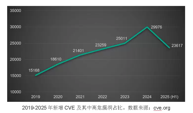 根据cve.org的数据,2025年上半年,无论是高危漏洞的数量还是注册CVE(通用漏洞披露)的总数均大幅增加。2024年初,每月注册的CVE数量约为2600个,全年呈增长趋势。相比之下,2025年每月注册的CVE数量已超过4000个。