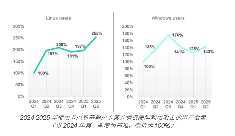 与2024年相比,2025年遭遇漏洞利用攻击的Linux用户数量呈上升趋势。具体而言,2025年第二季度受影响用户数量比2024年同期高出50多点,而2025年第一季度的数字更是接近2024年同期的两倍。