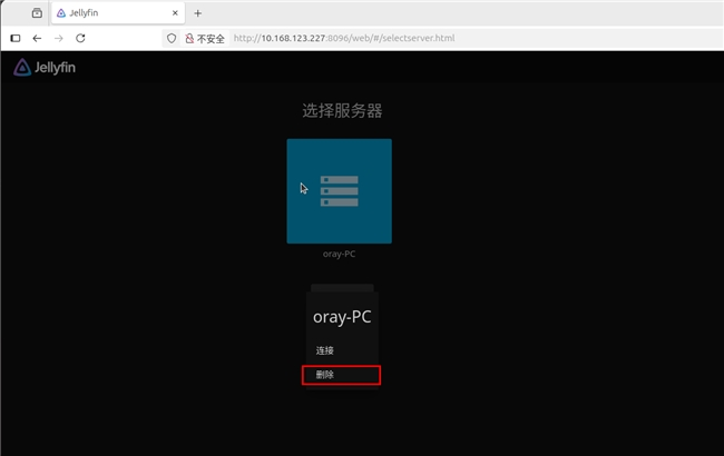 运行完成后,在浏览器访问 http://<本地 IP>:8096(示例:http://10.168.123.227:8096)。首次打开会提示删除默认服务器,随后进入初始化向导,按提示创建管理员账号、添加媒体库即可。