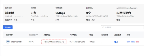 - 外网域名:系统会自动分配,也可自定义二级域名