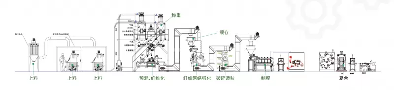 整线搭载 “传感器 + PLC 控制系统”,实时监控张力(调节精度 0.1N)、温度、成膜厚度等关键参数,数据可上传数字化系统溯源;关键设备如破碎机配置 16 只除尘布袋,原纤化设备采用密封防污染设计,从 “源头 + 过程” 控制粉尘污染,同时设备自动化程度高,人员经简单培训即可上手,减少人为操作误差,保障批量生产一致性。