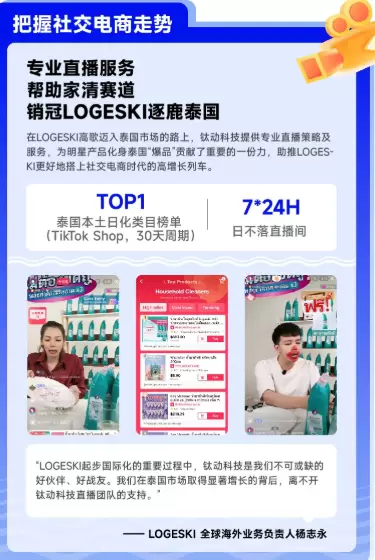 在泰国市场,钛动科技与家清品牌LOGESKI紧密合作,为其提供专业直播策略及服务。通过打造“日不落直播间”,实现7×24小时不间断直播覆盖,助力LOGESKI在TikTok Shop平台上冲上泰国本土日化类目热销TOP榜,一度登顶该类目榜首位置。“LOGESKI起步国际化的重要过程中,钛动科技是我们不可或缺的好伙伴、好战友。我们在泰国市场取得显著增长的背后,离不开钛动科技直播团队的支持。”LOGESKI全球海外业务负责人杨志永对钛动科技的专业直播团队作出高度评价。