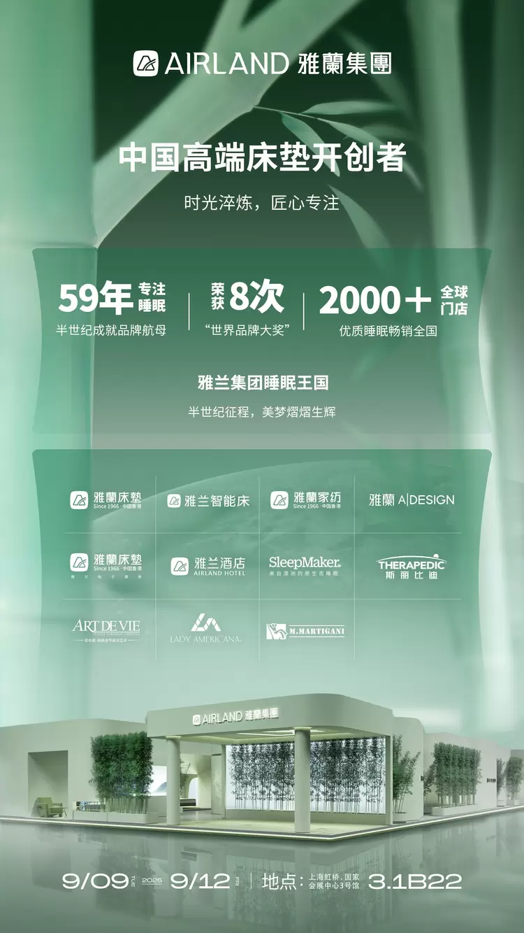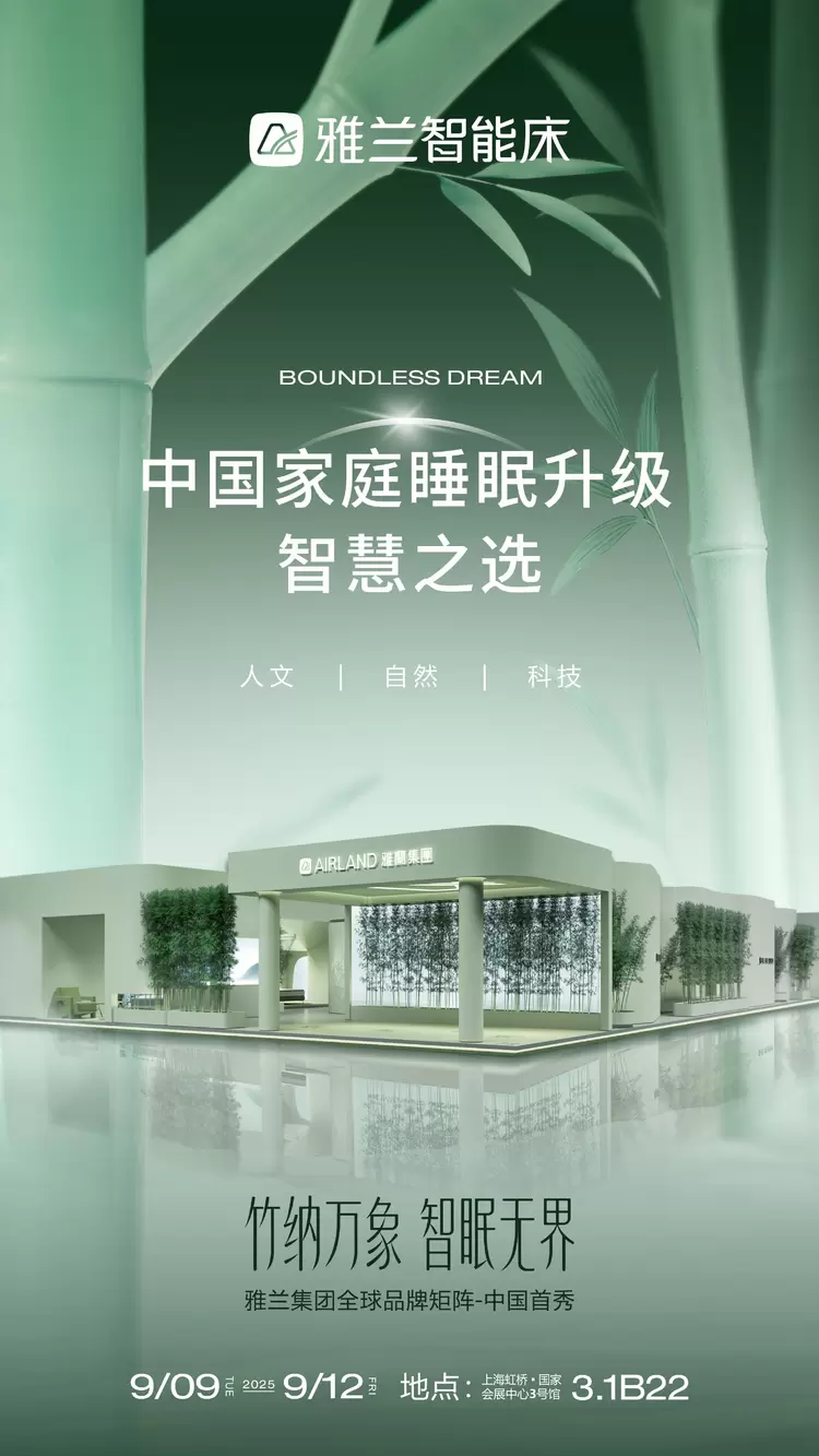 当行业竞争从单一的产品功能转向场景与理念的深度融合,从“功能清单”进化到“体验闭环”,构建清晰的方法论已成为品牌突围的关键。雅兰以「竹」为灵感内核,以智能科技为实现手段,借由概念馆这一沉浸式场景载体,打造出一套可感知、可度量、可复用的增长体系。9月9日至12日,诚邀您亲临上海虹桥国家会展中心3.1B22展位,见证雅兰如何重新定义睡眠与生活的未来场景。