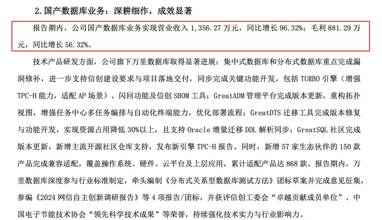 创意信息,8月28日发布了2025年上半年财报,旗下数据库业务(万里数据库)成绩单就挺亮眼:半年营收1356.27万元,同比增长96.32%;毛利881.29万元,同比涨了56.32%。
