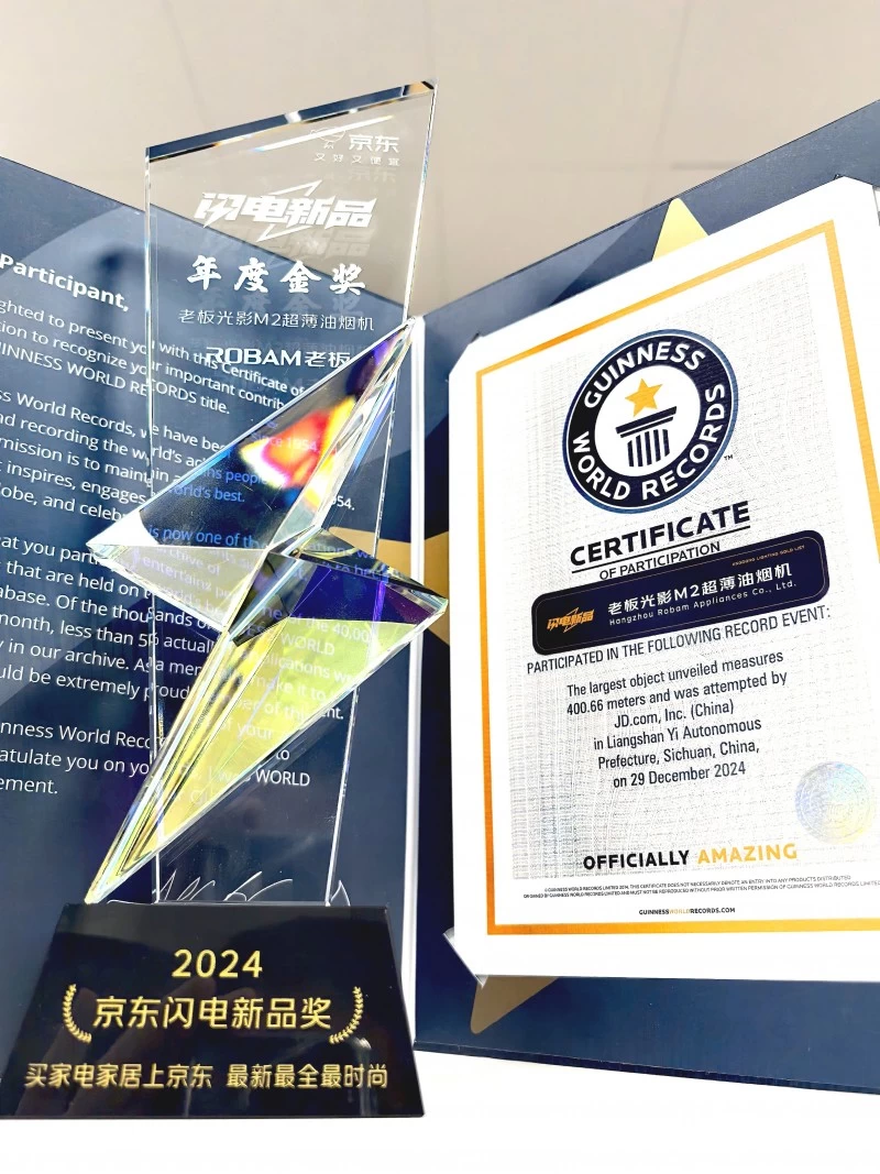以此同时,老板电器旗下产品凭借领先的技术实力和强劲的产品性能获得了京东多项荣誉。比如,光影 M2 油烟机不仅荣获 2024 年「京东闪电新品年度金奖」,还携手京东共创吉尼斯世界纪录,老板燃气灶 57B2D 亦摘得同年京东金榜「年度灶具金奖」。无论是从市场业绩、产品科技力、还是消费者口碑,老板电器从多维度彰显行业领头羊实力,让消费者尽享便捷健康的烹饪生活。