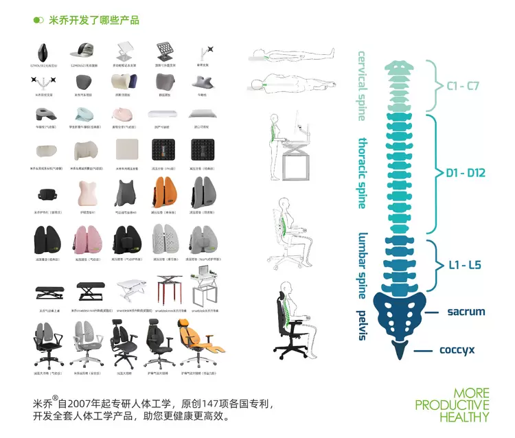 《优化肌肉骨骼工作负荷的人类工效学指南》国家标准的发布实施,标志着我国在工作相关肌肉骨骼疾病预防领域迈出了关键一步。值此契机,米乔人体工学将助力推动新标准在千行百业的落地应用,同时,不断将更前沿的人因工程技术融入产品研发。目前,米乔人体工学的专利产品涵盖撑腰、护颈、美臀、办公、居家、睡眠等多个系列。