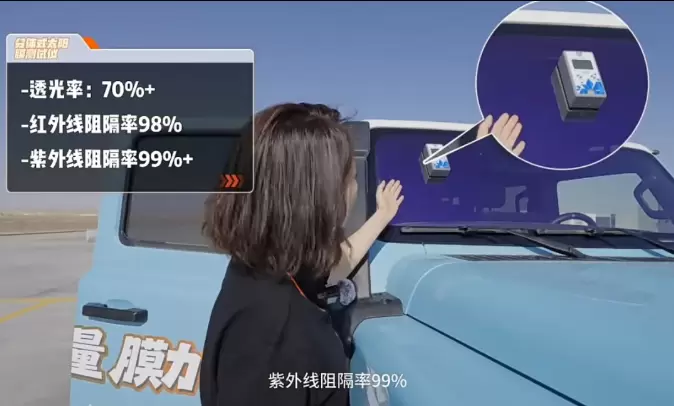 紫外线阻隔率 99%+ :近乎满分的紫外线阻隔能力,能有效保护车内人员皮肤免受紫外线伤害,同时延缓内饰、座椅的老化褪色。