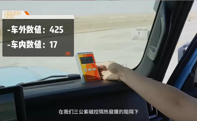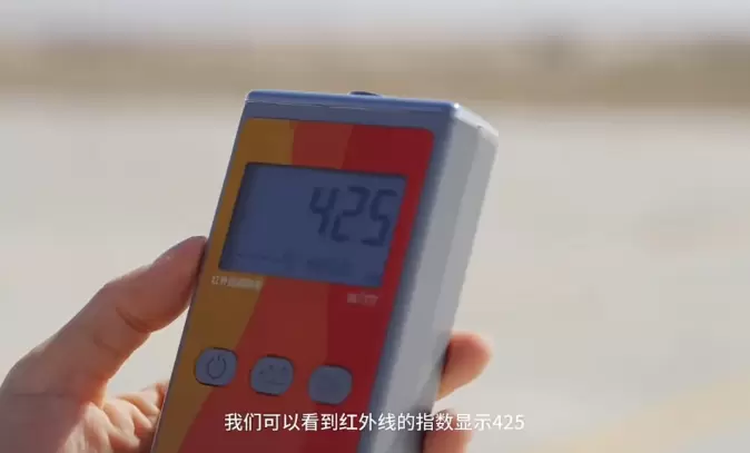 在露天环境下打开仪器,数据显示环境红外线指数为425—— 这意味着此时太阳辐射的热量正强烈传递。随后,将仪器置于贴有膜小二三公紫的车内,数值降至17!